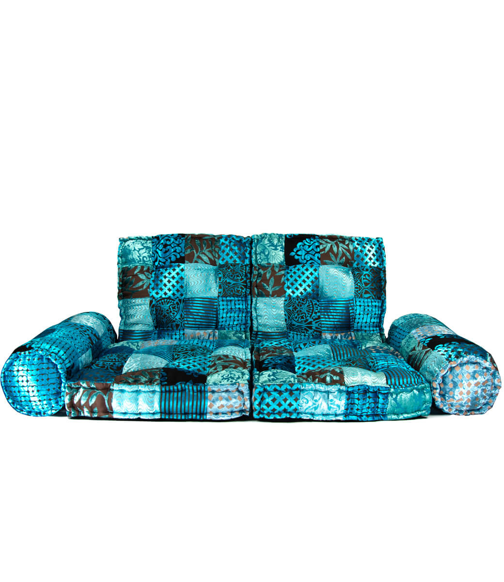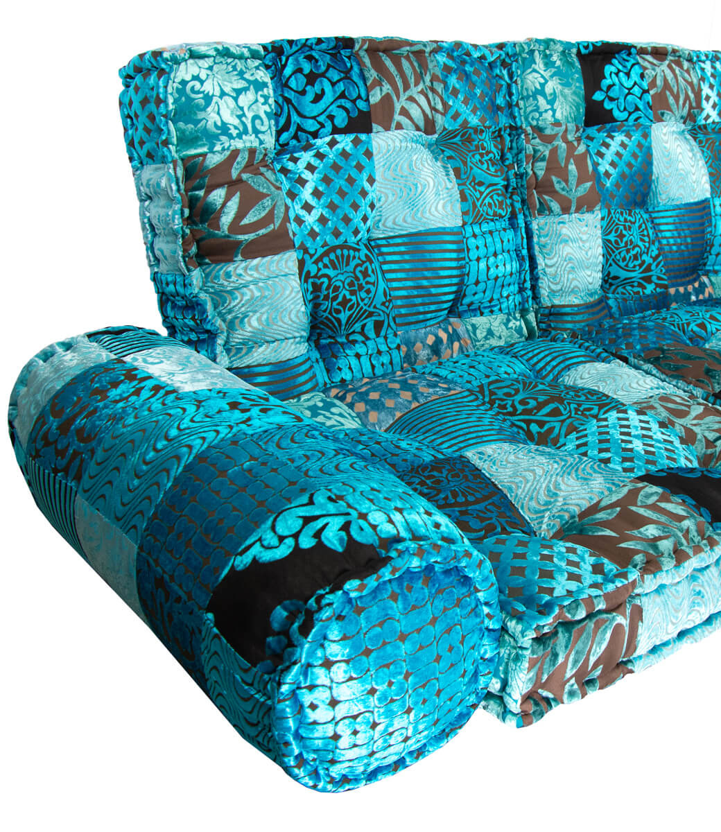 Türkises Kissenbank-Set, speziell für eine Loungebank aus Paletten, hergestellt aus Samt-Patchwork.Lesen Sie mehr