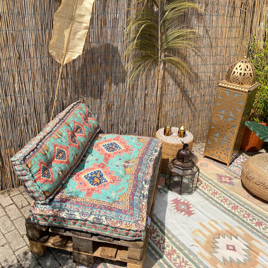 Erstelle in wenigen Minuten die ideale Bank, hol dir einige Europaletten nach Hause und lege diese Palettenkissen darauf - und schon kannst du es dir in der Sonne gemütlich machen. Der Stoff fühlt sich weich an und hat einen Kelim-Druck mit einem schönen orientalischen Design. Die Sitzmatratze und das lange Rückenkissen sind wunderbar bequem und gut gefüllt. Die Unterseite ist in derselben Farbe aus grauem Stoff gefertigt. Dazu passend gibt es auch Kissen, Armrollen und Poufs. Die Abmessungen betragen 120 x 80 x 15 für den Sitzbereich und 120 x 30 x 15 für das Rückenkissen. Kein Urlaub in diesem Jahr? Doch, natürlich! Einfach in deinem eigenen Garten!
