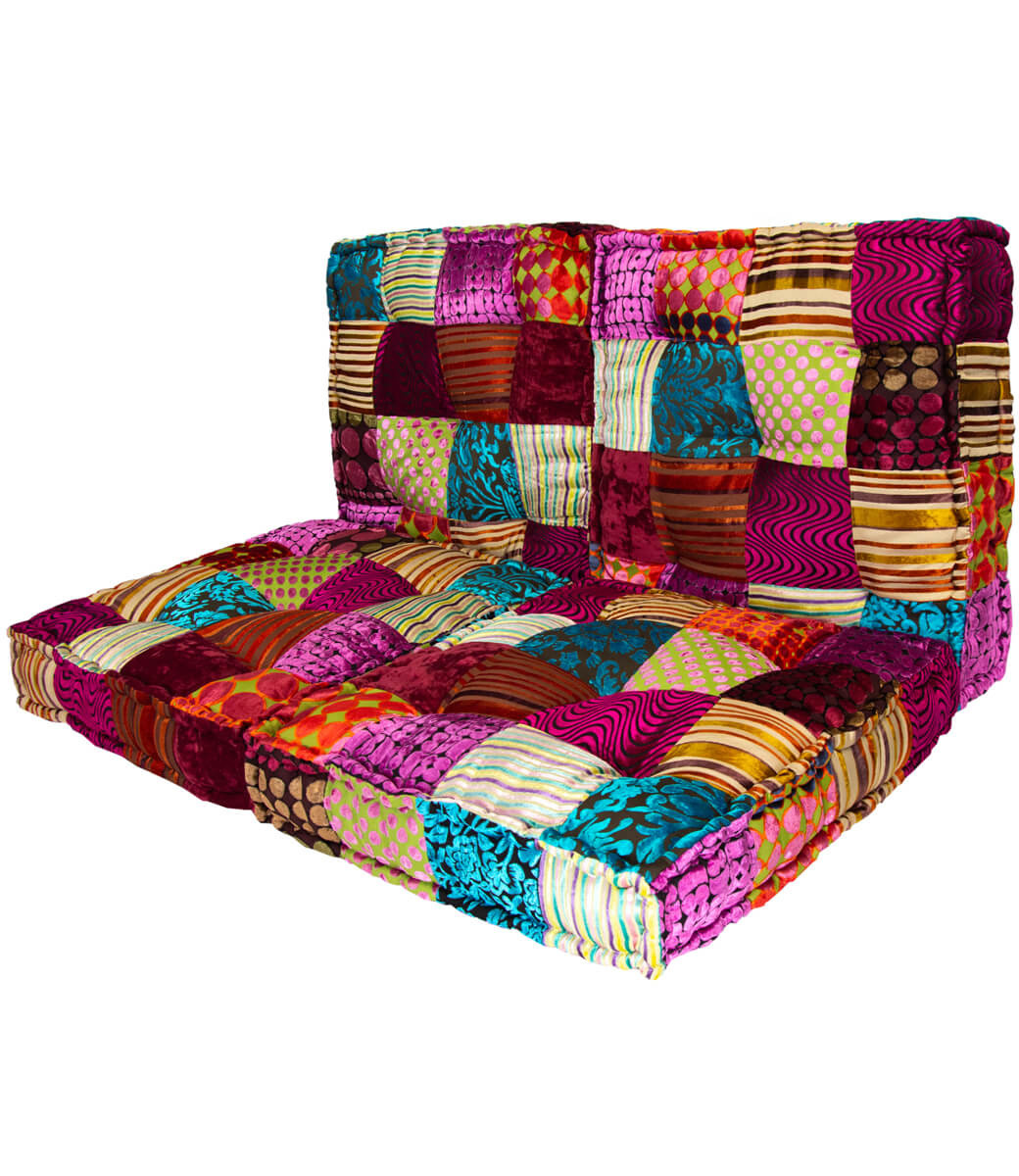 Ganz viel Gemütlichkeit und Farbe mit diesem Samt-Patchwork-Matratzenset, bestehend aus 4 Matratzen mit den Maßen 60 x 60 x 12. Es gibt viele passende Kissen und sogar einen Hocker dazu. So wird es drinnen oder draußen richtig bunt und gemütlich. Der Stoff ist weiches Samt, und alle Stoffstücke sind in Handarbeit in Indien gefertigt.