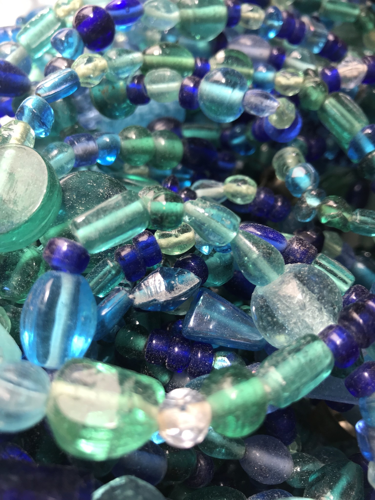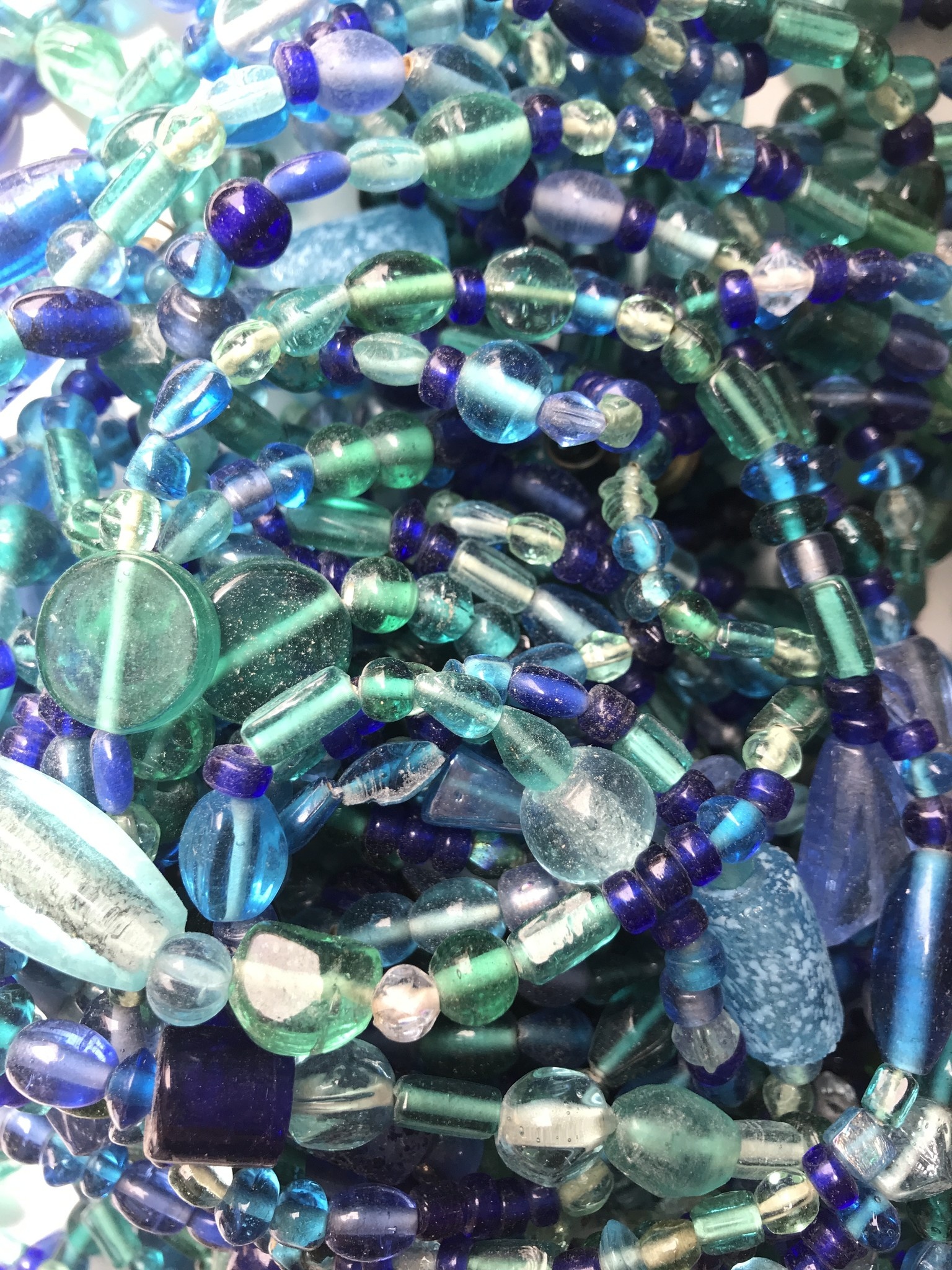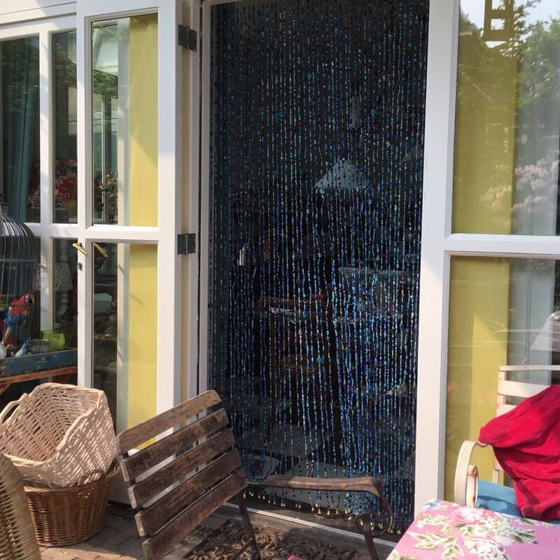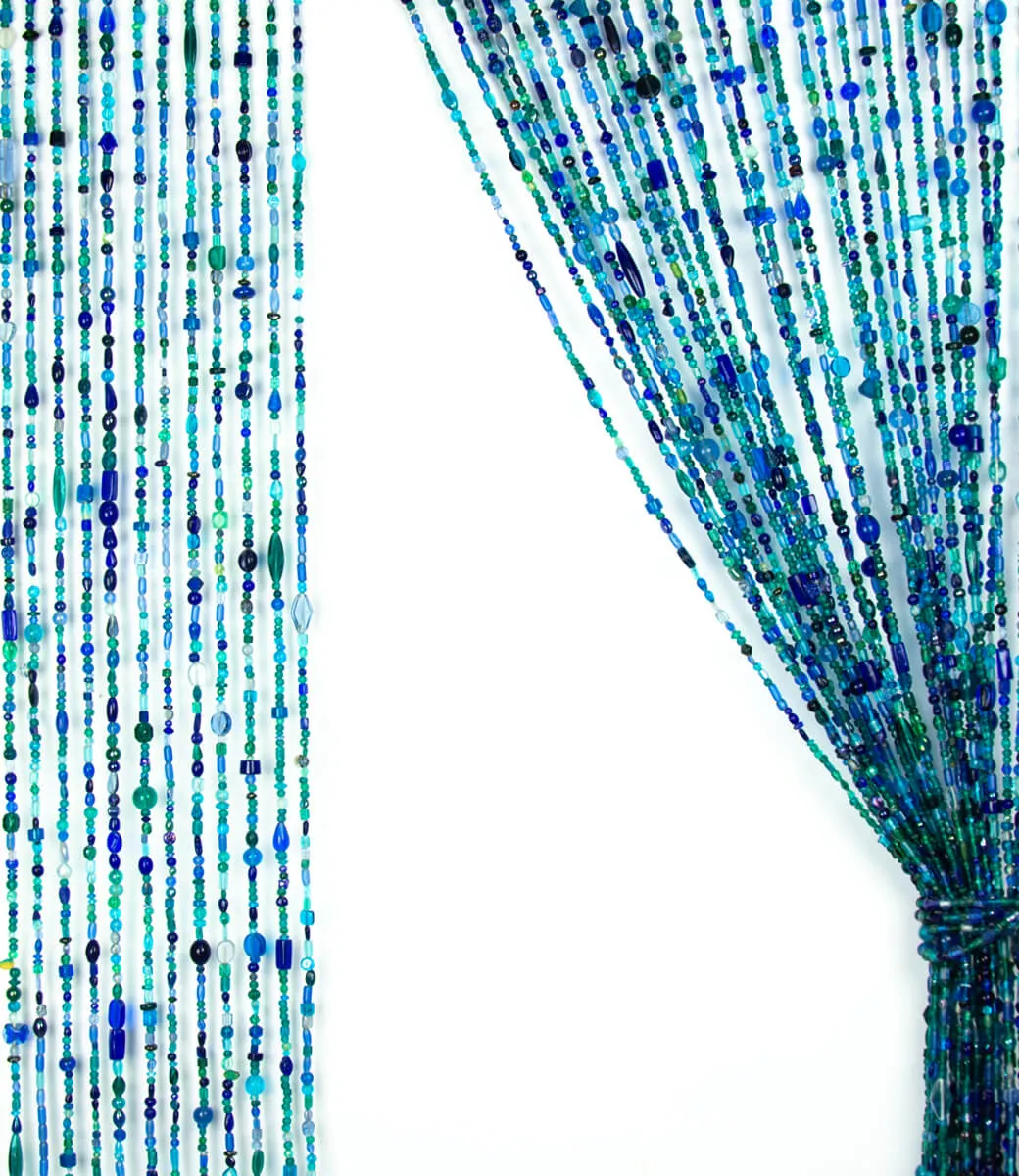 Ein eleganter Glasperlenvorhang in wunderschönen Blau- und Türkistönen mit verschiedenen Perlenformen und -größen – ein verspieltes und stilvolles Wohnaccessoire. Wenn die Sonne darauf scheint, funkeln die Glasperlen wunderschön. Zudem ist der Vorhang praktisch, da er Insekten fernhält und gleichzeitig für eine gemütliche Atmosphäre sorgt.