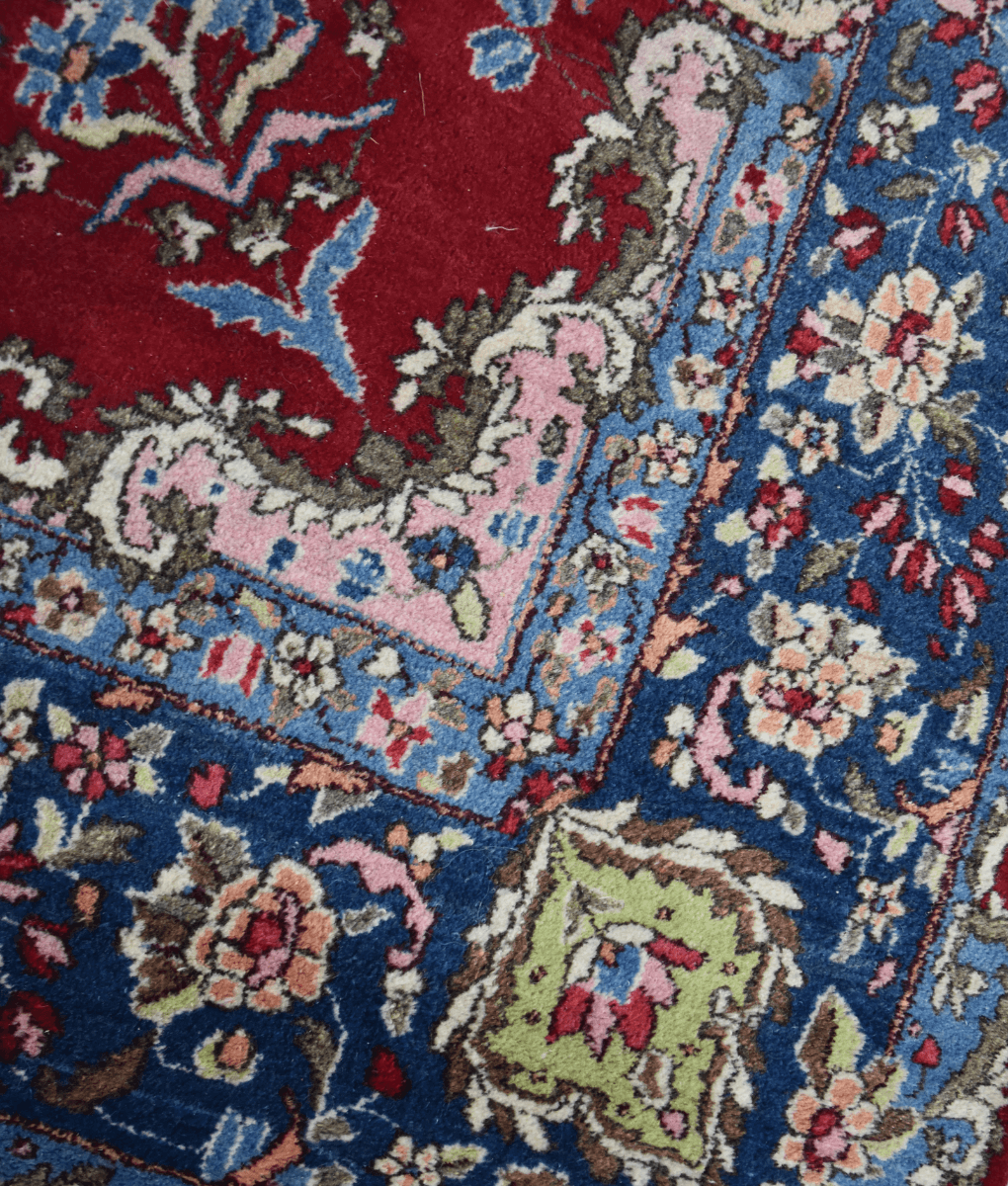 Ein echter persischer Teppich mit wunderschönen Details in Rot und Blau. Schafft eine echte Atmosphäre im Raum! Der Teppich ist auch angenehm weich unter den Füßen und von sehr guter Qualität. Ein echter Kirman-Teppich aus dem früheren Persien! Die Knotendichte beträgt zwischen 100.000 und 150.000 Knoten pro Quadratmeter.