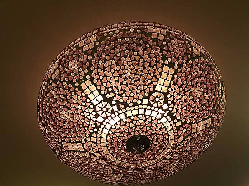 Wie gemütlich ist doch diese lila Deckenleuchte aus Glasmosaik! Die lila Steine strahlen warm, wenn das Licht eingeschaltet ist. Mit einem Durchmesser von 50 cm ist diese Deckenlampe ein echter Blickfang an Ihrer Decke. Sie benötigt zwei Glühbirnen mit maximal 40 Watt, wobei 25 Watt für eine warme Atmosphäre sorgen. Die lila Farbe lässt sich auch gut mit einem Brocante-Wohnstil kombinieren. Schon im ausgeschalteten Zustand ist diese Lampe ein Schmuckstück, aber wenn Sie sie einschalten, scheinen alle lila Glasmosaikstücke durch, nicht jedoch die Fugen. So kommen die Muster wunderschön zur Geltung, wie auf dem ersten Bild zu sehen ist. Natürlich sind die Deckenlampen so am schönsten! Auf dem letzten Bild ist die Lampe im ausgeschalteten Zustand abgebildet.