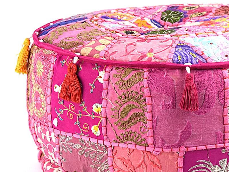 Ein rosa Bohemian-Pouf aus Patchwork-Stoffen aus Indien mit Perlen und Quasten in rosa Farbtönen. Perfekt, um Ihrem Interieur Farbe und Gemütlichkeit zu verleihen.Lesen Sie mehr