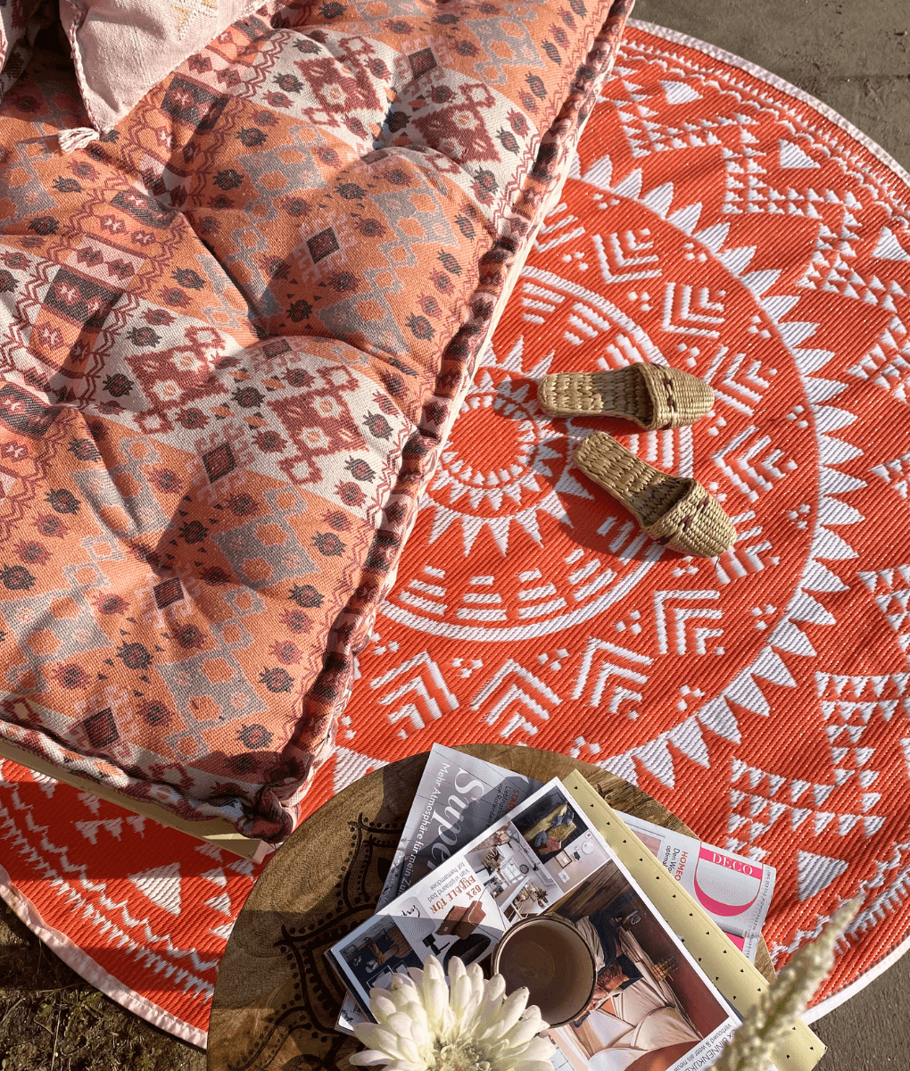 Runder Outdoor-Teppich in einer wunderschönen Farbkombination aus Creme und Terra und einem Bohemian-Muster. Verschönert Ihren Sitzbereich im Garten!Lesen Sie mehr