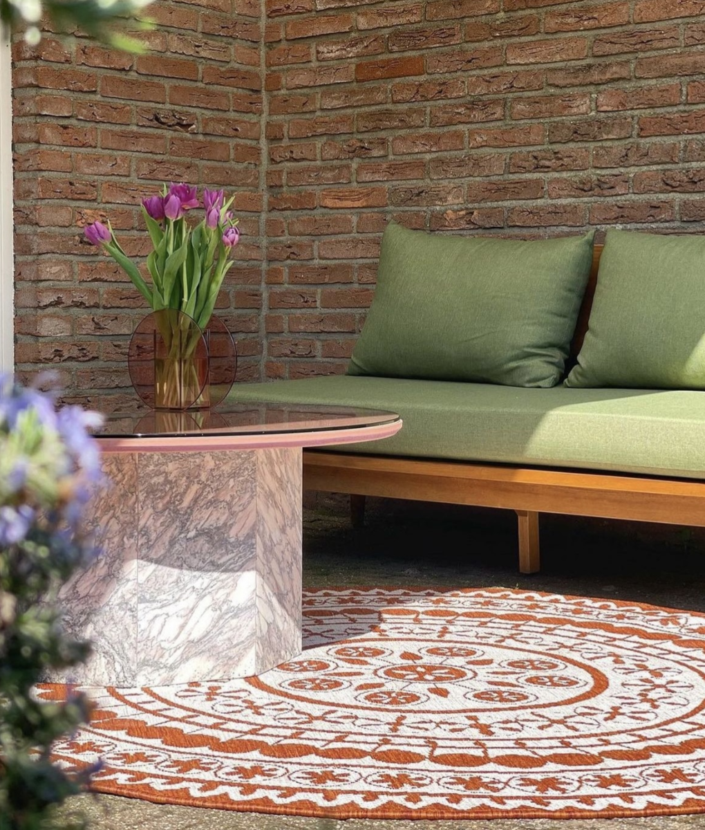Rundes Outdoor-Teppich mit Jute-Look in Terra und Creme, gewebt in einem orientalischen Muster, speziell für den Garten oder die Terrasse. Der Teppich hat ein warmes Aussehen und Gefühl, und der Regen fällt einfach hindurch und trocknet leicht wieder auf. Der Teppich lässt sich leicht mit Wasser reinigen und kann sowohl drinnen als auch draußen verwendet werden. Hergestellt aus umweltfreundlichen Kunststofffasern und hat einen natürlichen Glanz. Bei Allergien ist auch Polypropylen eine gute Wahl, da es keine Fasern verbreitet oder Staub anzieht.