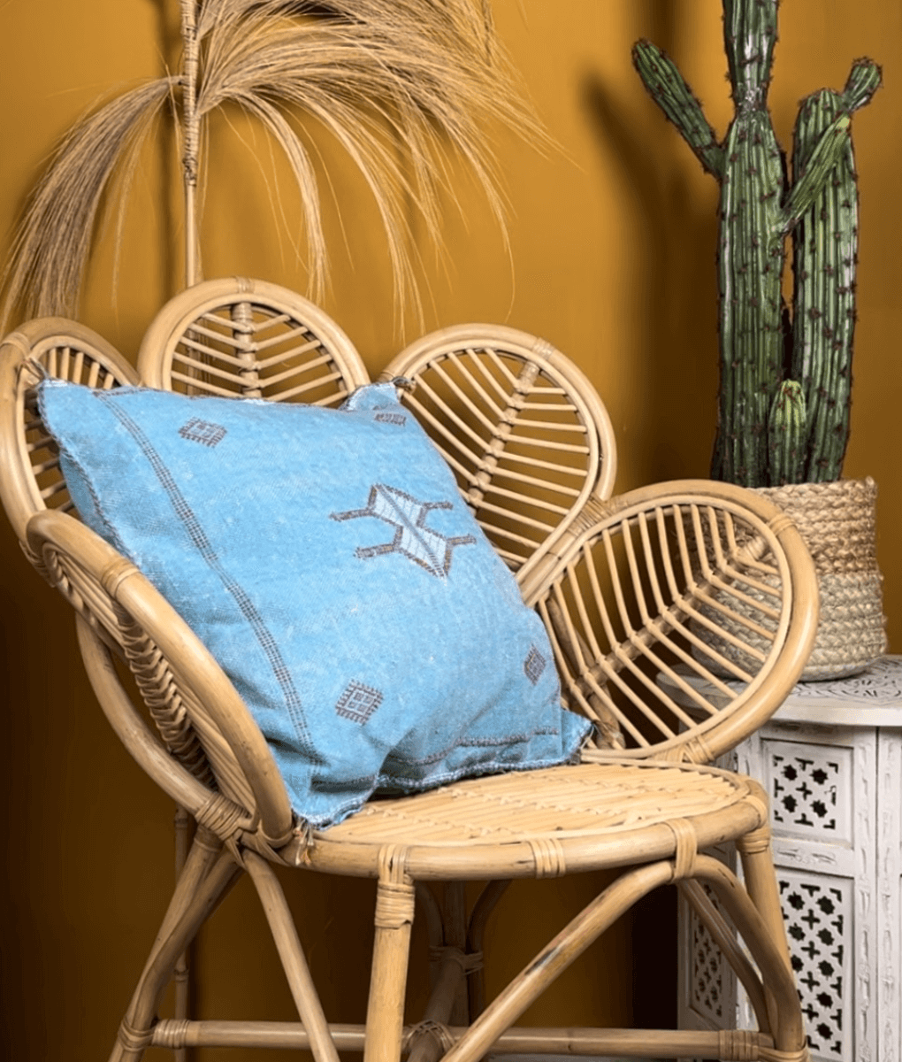 Veganes blaues Sabra-Kissen für das Sofa mit verspielten Nähten und Quasten an jeder Stelle. Schöne weiche Kissen zum Genießen im Sommer, sie sind in sommerlich süßen Pastellfarben gehalten. Jede Farbe ist ein Unikat, da ihr von Hand ein Farbbad gegeben wird. Das Kissen besteht aus Sabra-Fasern, einem weichen, seidigen Stoff, der aus der Kaktuspflanze Aloe Vera gewonnen wird. Die langen, spitzen Blätter des Kaktus werden zerkleinert, die Fasern gewaschen und gehämmert, dann werden die Blätter in Wasser eingeweicht. Die Fasern werden gesponnen und zu einer Garnrolle verarbeitet. Die Farben bestehen aus völlig natürlichen Farbstoffen wie Safran, Indigo und Henna. Die Kissen werden von Kunsthandwerkern aus Marokko mit einem stabilen Reißverschluss handgefertigt.