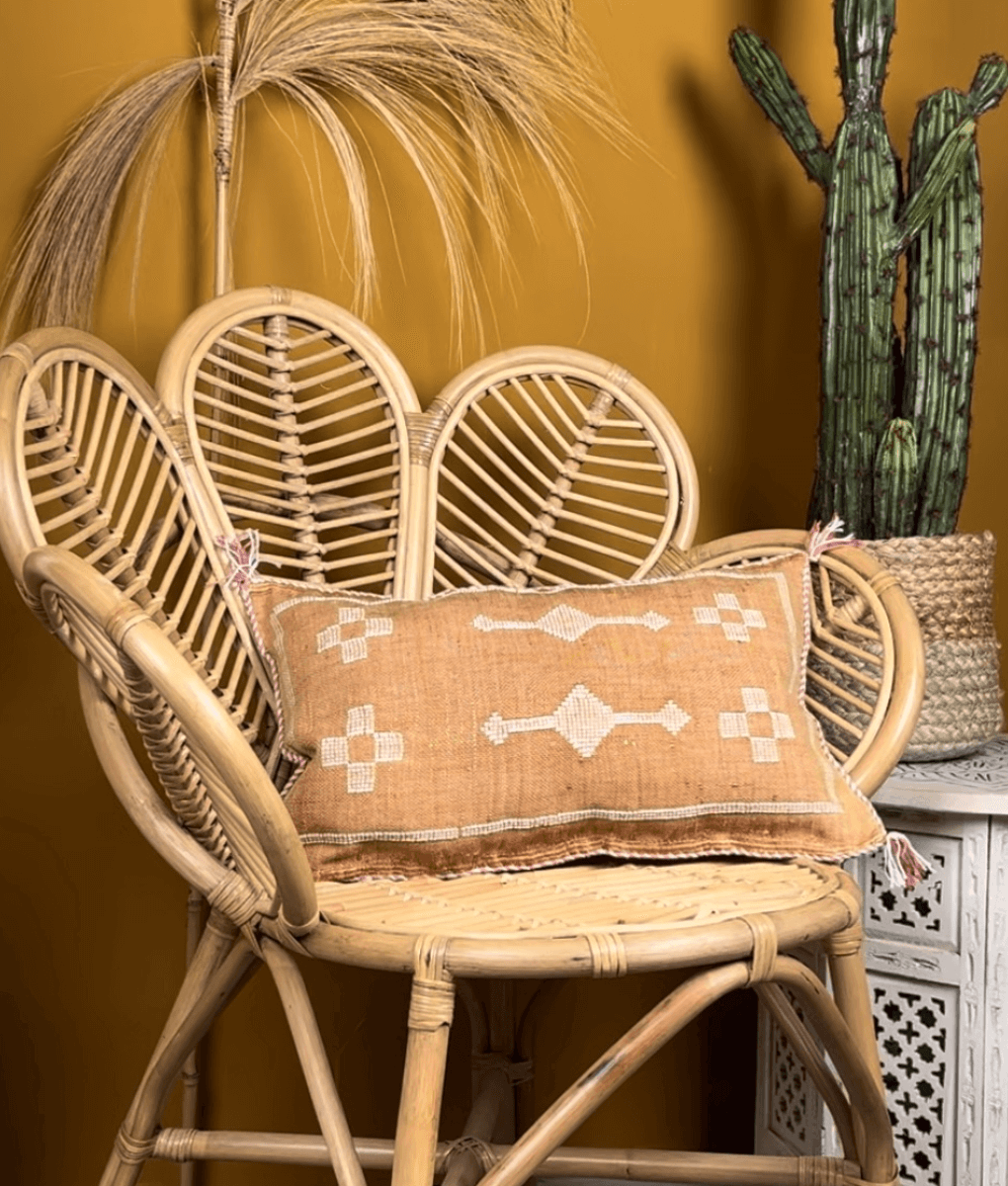 Veganes braunes Sabra-Kissen für das Sofa mit verspielten Nähten und Quasten an jeder Stelle. Schöne weiche Kissen zum Genießen im Sommer, sie sind in sommerlich süßen Pastellfarben gehalten. Jede Farbe ist ein Unikat, da ihr von Hand ein Farbbad gegeben wird. Das Kissen besteht aus Sabra-Fasern, einem weichen, seidigen Stoff, der aus der Kaktuspflanze Aloe Vera gewonnen wird. Die langen, spitzen Blätter des Kaktus werden zerkleinert, die Fasern gewaschen und gehämmert, dann werden die Blätter in Wasser eingeweicht. Die Fasern werden gesponnen und zu einer Garnrolle verarbeitet. Die Farben bestehen aus völlig natürlichen Farbstoffen wie Safran, Indigo und Henna. Die Kissen werden von Kunsthandwerkern aus Marokko mit einem stabilen Reißverschluss handgefertigt.