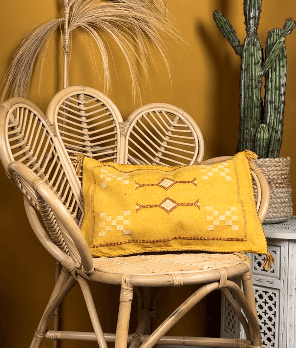 Marokkanisches Sabra-Kissen in sommerlichem Gelb mit burgunderroten und gelben Nähten. Mit diesem gemütlichen Kissen können Sie Ihr Interieur verschönern!Lesen Sie mehr