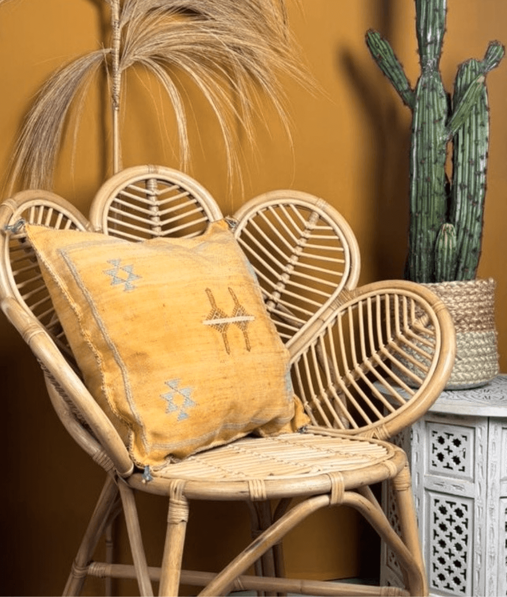 Veganes gelbes Sabra-Kissen für das Sofa mit verspielten Nähten und Quasten an jeder Stelle. Schöne weiche Kissen zum Genießen im Sommer, sie sind in sommerlich süßen Pastellfarben gehalten. Jede Farbe ist ein Unikat, da ihr von Hand ein Farbbad gegeben wird. Das Kissen besteht aus Sabra-Fasern, einem weichen, seidigen Stoff, der aus der Kaktuspflanze Aloe Vera gewonnen wird. Die langen, spitzen Blätter des Kaktus werden zerkleinert, die Fasern gewaschen und gehämmert, dann werden die Blätter in Wasser eingeweicht. Die Fasern werden gesponnen und zu einer Garnrolle verarbeitet. Die Farben bestehen aus völlig natürlichen Farbstoffen wie Safran, Indigo und Henna. Die Kissen werden von Kunsthandwerkern aus Marokko mit einem stabilen Reißverschluss handgefertigt.