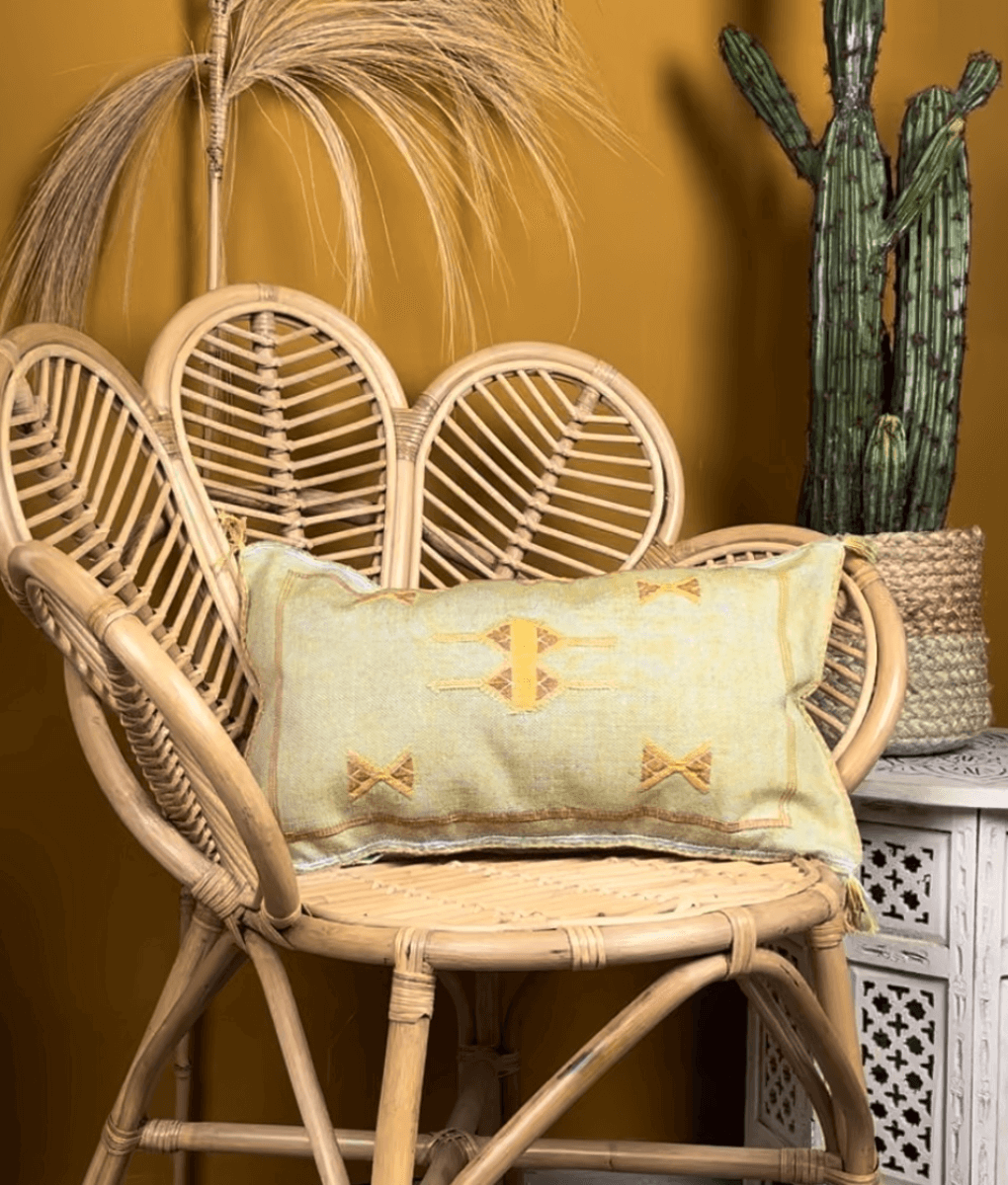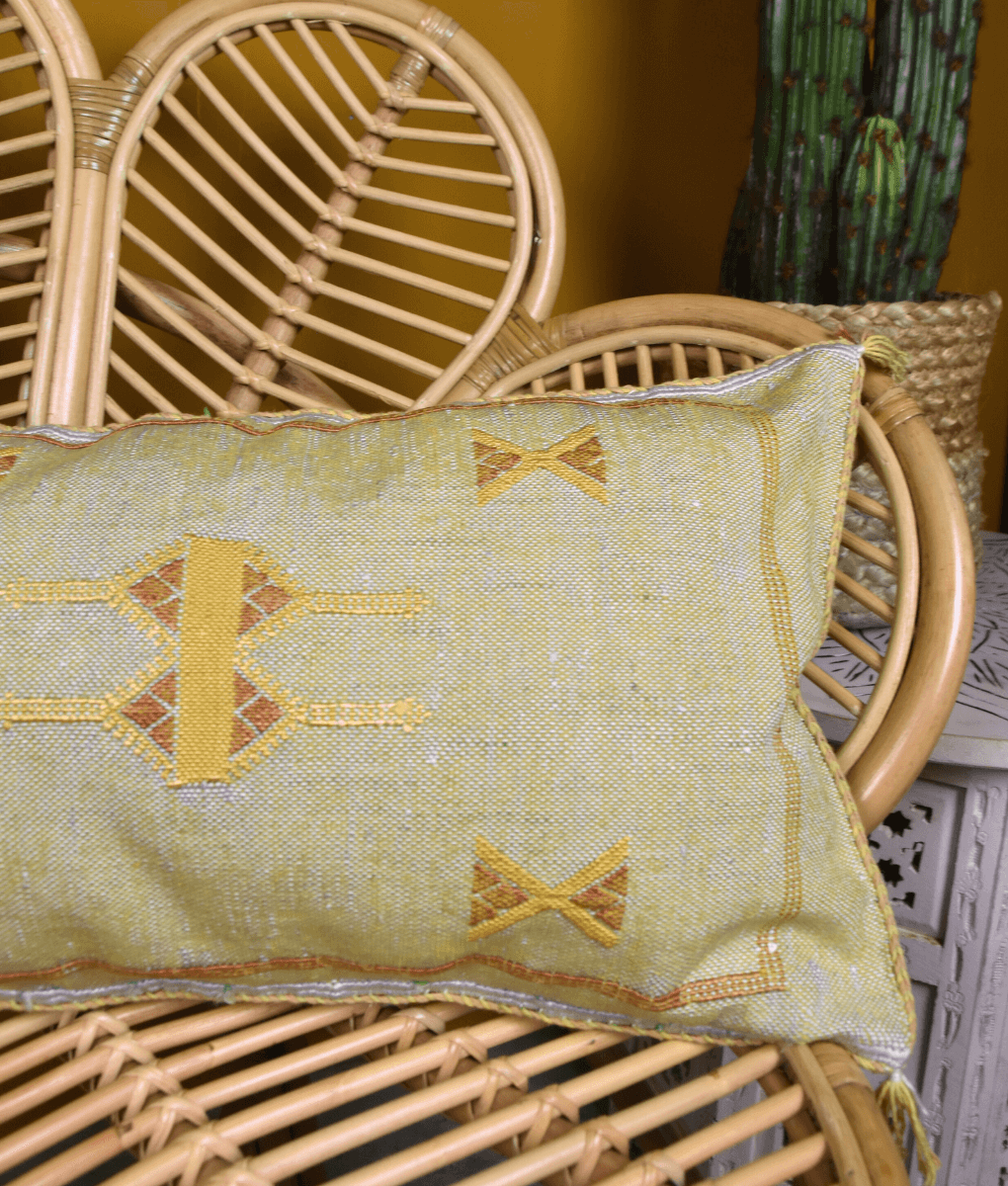 Veganes grünes Sabra-Kissen für das Sofa mit verspielten Nähten und Quasten an jeder Stelle. Schöne weiche Kissen zum Genießen im Sommer, sie sind in sommerlich süßen Pastellfarben gehalten. Jede Farbe ist ein Unikat, da ihr von Hand ein Farbbad gegeben wird. Das Kissen besteht aus Sabra-Fasern, einem weichen, seidigen Stoff, der aus der Kaktuspflanze Aloe Vera gewonnen wird. Die langen, spitzen Blätter des Kaktus werden zerkleinert, die Fasern gewaschen und gehämmert, dann werden die Blätter in Wasser eingeweicht. Die Fasern werden gesponnen und zu einer Garnrolle verarbeitet. Die Farben bestehen aus völlig natürlichen Farbstoffen wie Safran, Indigo und Henna. Die Kissen werden von Kunsthandwerkern aus Marokko mit einem stabilen Reißverschluss handgefertigt.