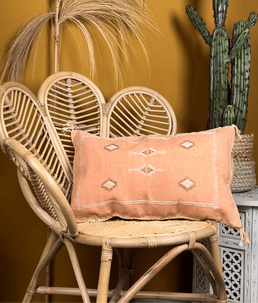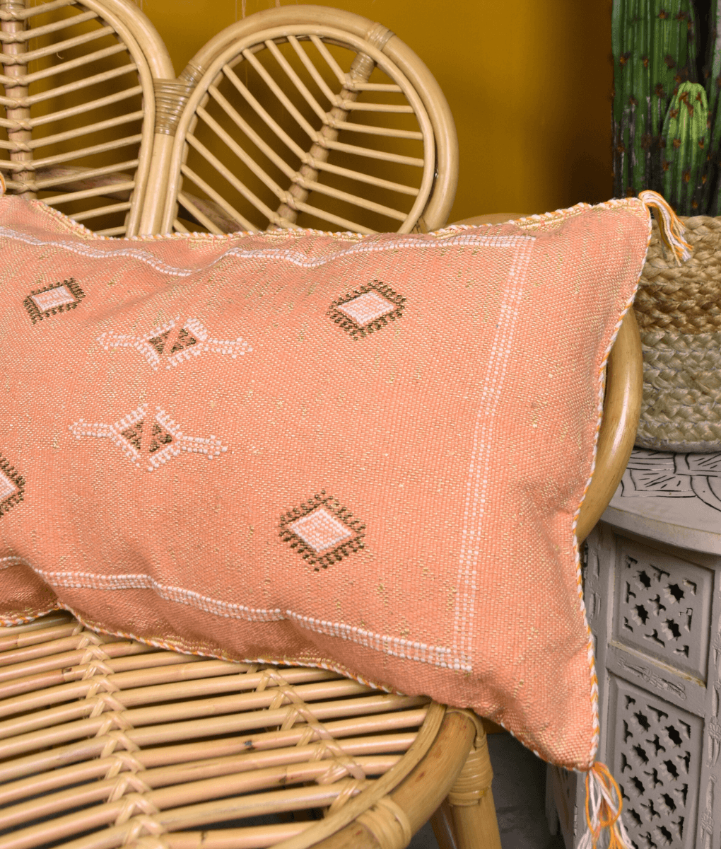 Veganes Sabra-Kissen in Orange für das Sofa mit verspielten Nähten und Quasten an jeder Stelle. Schöne weiche Kissen zum Genießen im Sommer, sie sind in sommerlich süßen Pastellfarben gehalten. Jede Farbe ist ein Unikat, da ihr von Hand ein Farbbad gegeben wird. Das Kissen besteht aus Sabra-Fasern, einem weichen, seidigen Stoff, der aus der Kaktuspflanze Aloe Vera gewonnen wird. Die langen, spitzen Blätter des Kaktus werden zerkleinert, die Fasern gewaschen und gehämmert, dann werden die Blätter in Wasser eingeweicht. Die Fasern werden gesponnen und zu einer Garnrolle verarbeitet. Die Farben bestehen aus völlig natürlichen Farbstoffen wie Safran, Indigo und Henna. Die Kissen werden von Kunsthandwerkern aus Marokko mit einem stabilen Reißverschluss handgefertigt.