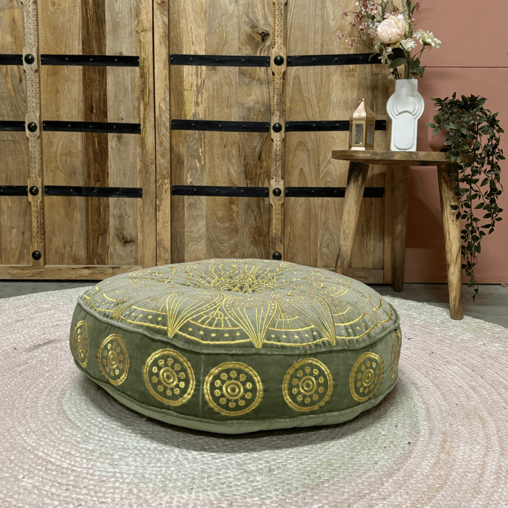Samt Bodenkissen in einer sanften grünen Farbe mit goldenen Details. Verziert mit einer wunderschönen goldenen Lotusblume auf der Oberseite. Perfekt zum Beispiel für Yoga, ein Haustier oder um sich einfach gemütlich hinzusetzen. Ursprünglich aus Indien.