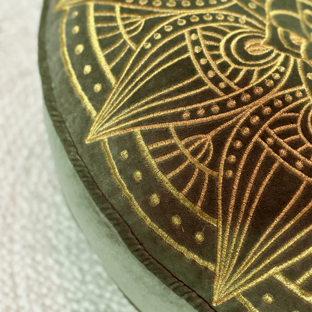 Samt Bodenkissen in einer sanften grünen Farbe mit goldenen Details. Verziert mit einer wunderschönen goldenen Lotusblume auf der Oberseite.Lesen Sie mehr