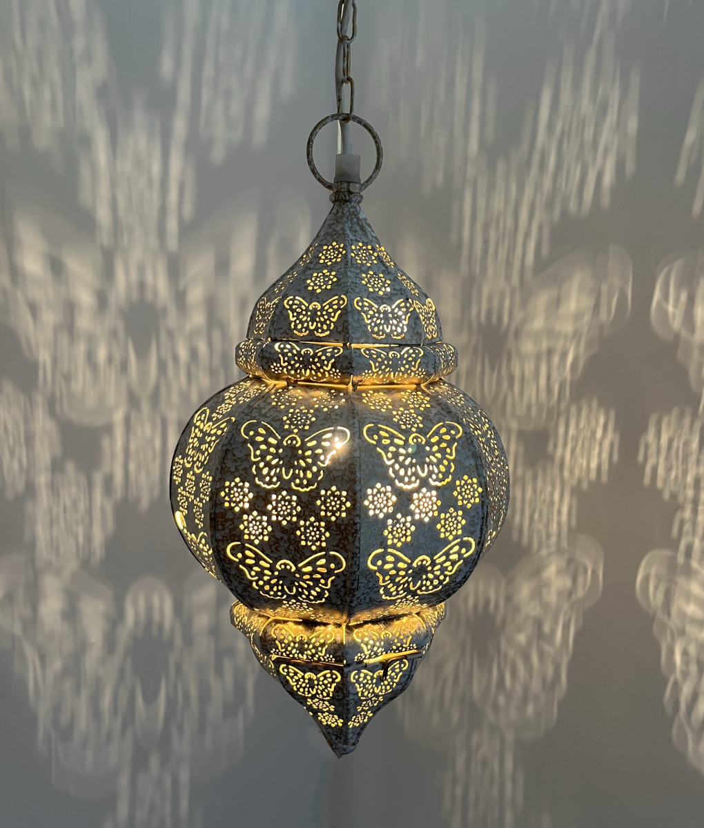 Lass dich von dem wunderschönen Schmetterlingsmuster verzaubern, das erscheint, sobald du die Lampe einschaltest. Diese Hängelampe hat eine weiß getünchte Außenseite und eine goldene Innenseite mit prachtvollen Schmetterlingen. Perfekt für das Kinderzimmer oder als stimmungsvolle Lampe im Wohnzimmer.