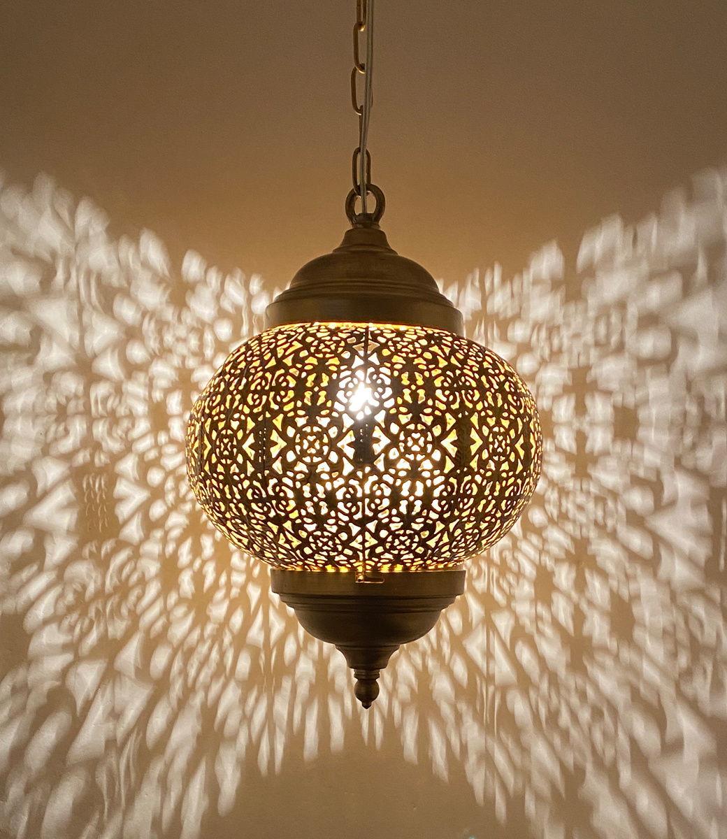 Hängelampe mit schwarzer Außenseite und goldener Innenseite, die am Abend eine warme orientalische Atmosphäre schafft. Tagsüber ist sie eine pechschwarze Lampe und passt daher auch gut in eine industrielle Einrichtung und zu robusten Stahltüren. Das zeigt, dass industrieller Stil und orientalische Elemente wunderbar miteinander harmonieren