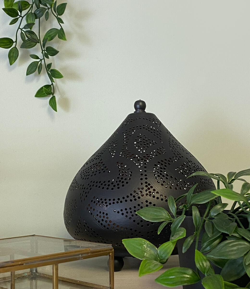 Eine "Kleine matte schwarze Tischlampe" ideal für ein Licht auf dem Nachttisch oder in einer Ecke, wo etwas Atmosphäre gewünscht ist. Die Innenseite ist goldfarben und strahlt warm und atmosphärisch durch, auch die Muster scheinen durch die Löcher hindurch. Dies wird als filigrane Tischlampe bezeichnet.