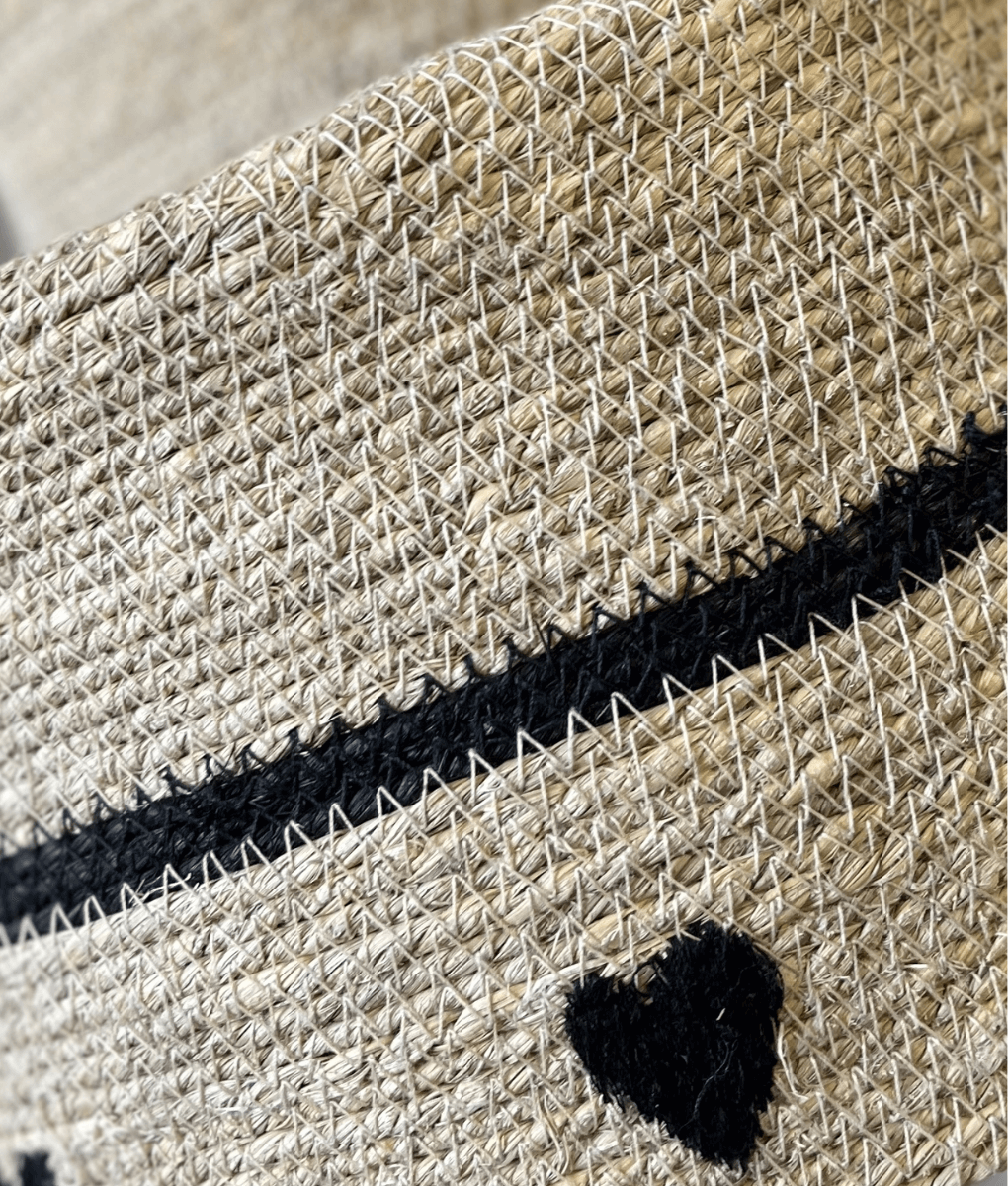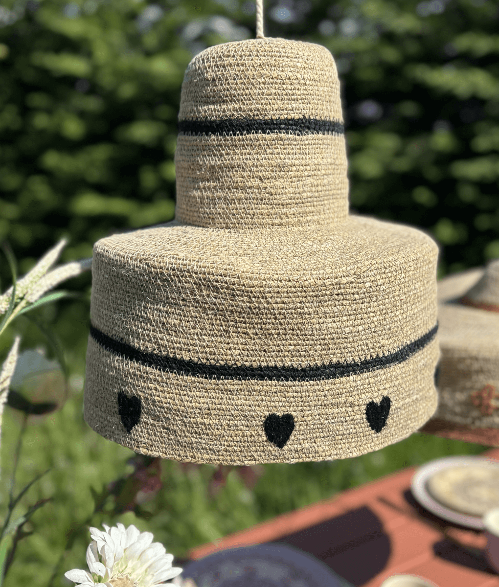 Ein cooler Lampenschirm mit einem wunderschönen natürlichen Look. Die Kappe besteht aus Seegras und die Details sind von Hand gestickt und haben eine coole schwarze Farbe. Sie können den Lampenschirm als Dekoration verwenden oder selbst eine Lampe hineinstecken und ihn wirklich als Lampe nutzen. Kombinieren Sie es mit den anderen Seegraslichtern für ein gemütliches Ganzes! Diese Form besteht aus einem schmalen Oberteil mit einer ausgestellten, größeren Kapuze, die Ihnen eine lustige, verspielte Form verleiht.