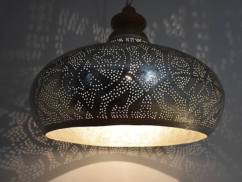Silberne große Hängelampe als orientalische Stimmungsbeleuchtung.