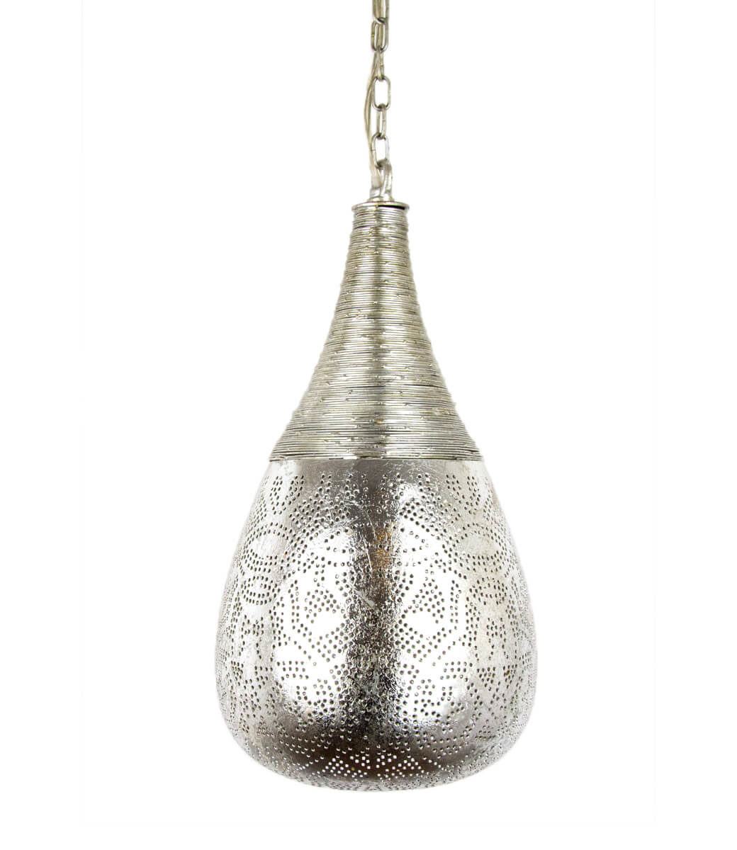 Silberne Hängelampe in Tropfenform im Vintage-Stil mit gedrehtem Metall an der Oberseite, eine stimmungsvolle orientalische Hängelampe.Lesen Sie mehr