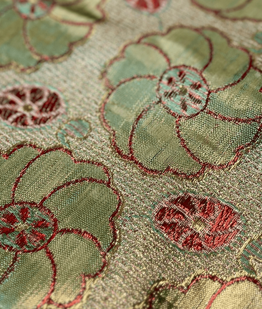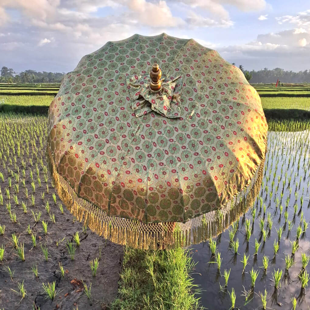 Sonnenschirm Wonderella in grüner Farbe mit großen Blumen, die in den luxuriösen goldfarbenen Stoff eingewebt sind. Dieser wunderschöne Schirmmacher verfügt über einen Holzstab in natürlicher brauner Farbe und handgeschnitzte Muster, die von Profis auf Bali von Hand mit Gold bemalt werden. Eine wirklich attraktive Farbe, auch wenn die Sonne nicht scheint, hat man sofort Farbe