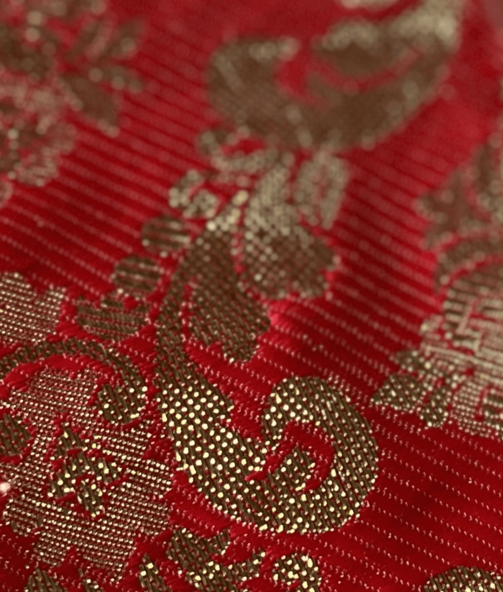 Sonnenschirm Wonderella in warmem Rot mit goldfarbenen Blumen, die in den luxuriösen Stoff eingewebt sind. Dieser wunderschöne Schirmmacher verfügt über einen Holzstab in natürlicher brauner Farbe und handgeschnitzte Muster, die von Profis auf Bali von Hand mit Gold bemalt werden. Eine wirklich attraktive Farbe, auch wenn die Sonne nicht scheint, hat man sofort Farbe