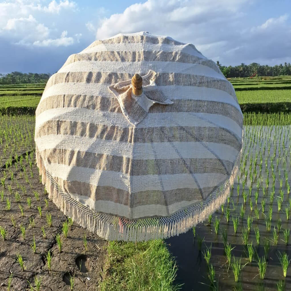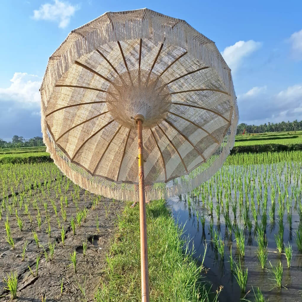 Sonnenschirm Bali mit eingewebter Jute in Taupe und Weiß. Dieser wunderschöne Schirmmacher verfügt über einen Holzstab in natürlicher brauner Farbe und handgeschnitzte Muster, die von Profis auf Bali von Hand mit Gold bemalt werden. Eine wirklich attraktive Farbe, auch wenn die Sonne nicht scheint, hat man sofort Farbe
