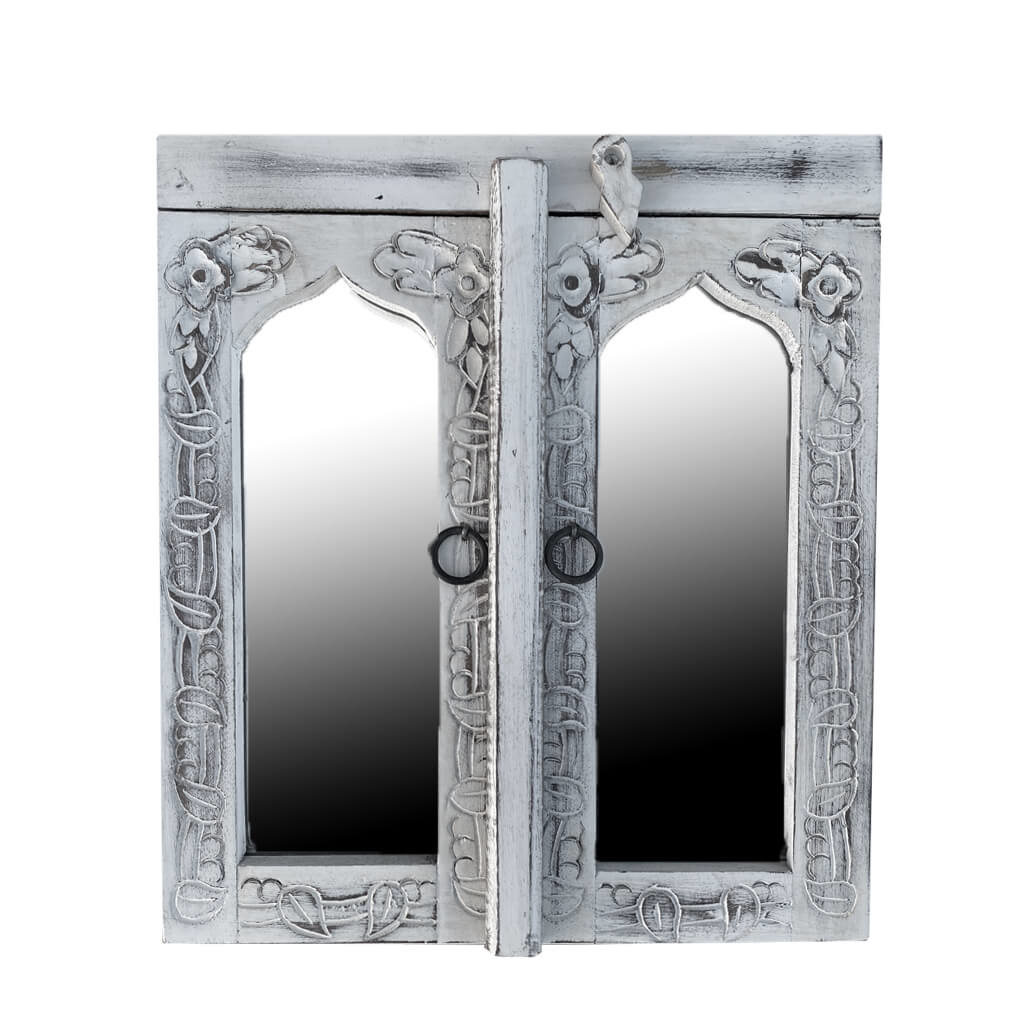 Badmöbel im Vintage-Stil, handgefertigt aus Indien, mit weißen, verspiegelten Türen. Ideal, um in der Küche oder im Badezimmer eine Atmosphäre zu schaffen oder um Ihre Kosmetik und Schmuck darin aufzubewahren.