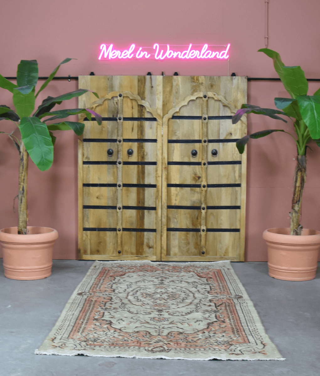 Vintage Teppich mit einem sanften grünen Hintergrund und warmen orangefarbenen Akzenten. Ein echter Blickfang in deinem Interieur! Handgefertigt in der Türkei mit Liebe. Daher geben wir dem Teppich gerne ein zweites Leben.