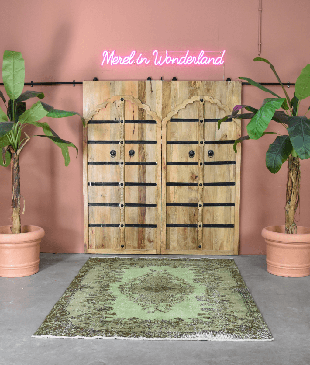 Stimmungsvoller Vintage-Teppich in einem warmen Grünton mit einem authentischen alten Kelim-Muster. Ein echter Blickfang für dein Zuhause! Handgefertigt in der Türkei, wir geben diesem Teppich gerne ein zweites Leben.