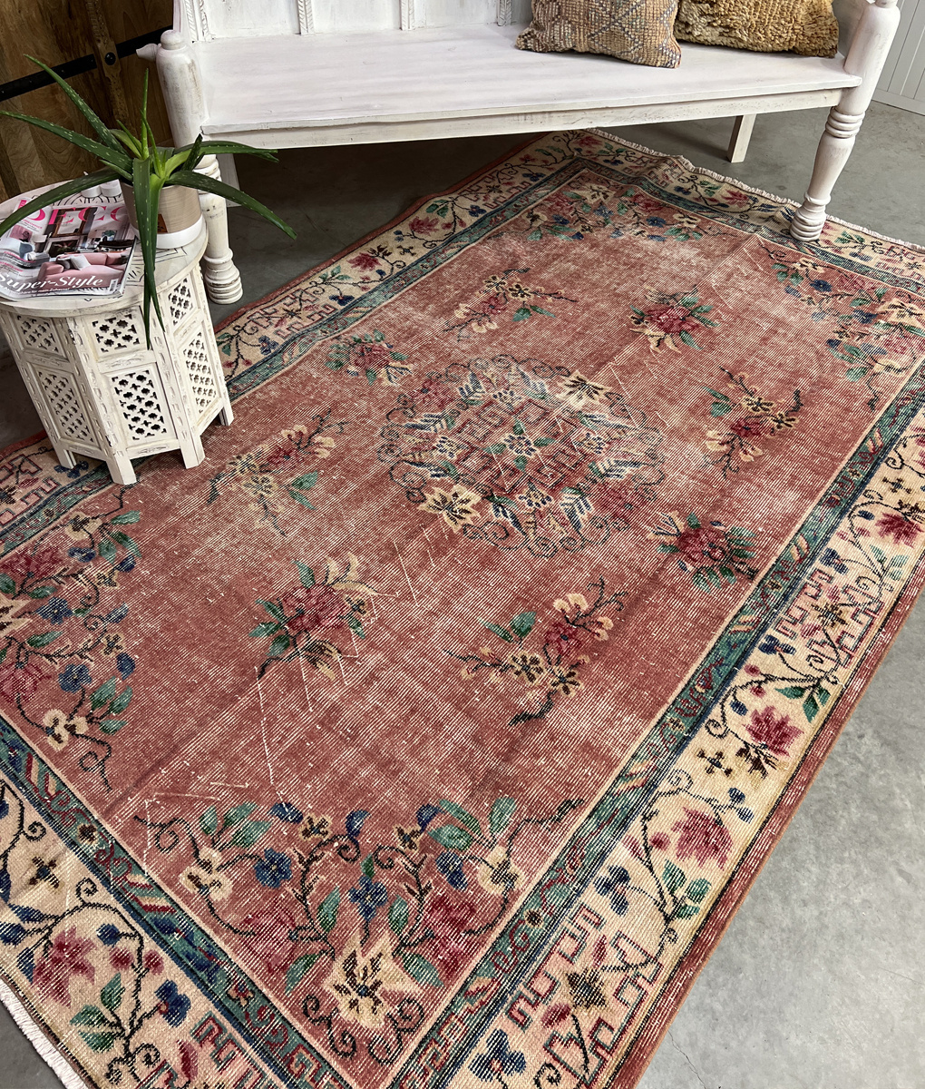 Ein wunderschönes Vintage-Teppich, hergestellt aus warmer Wolle und daher sehr gut geeignet, um es in Ihrem Zuhause gemütlich und behaglich zu gestalten. Das Muster zeigt elegante Blumensträuße, die in den Teppich gewebt sind. Die Grundfarbe ist warm, und die Blumen sind in verschiedenen Farben, was eine schöne Kombination ergibt. Jeder Teppich ist einzigartig und handgefertigt.