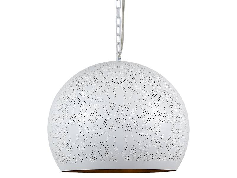 Runde orientalische Hängelampe mit weißem äußeren und überraschend schöner blattgoldener Innenseite. Die Muster in der Metallkugel, auch als filigrane Muster bezeichnet, erzeugen eine stimmungsvolle Beleuchtung an der Wand. Auch die Oberseite der runden Hängelampe ist gemustert, wodurch das Licht in der Lampe schön verteilt wird und Sie gutes Licht beispielsweise über dem Esstisch haben. Eine offene Hängelampe sollte natürlich auch schön aussehen, wenn Sie hineinschauen, daher ist das Vintage-Gold an der Innenseite wunderschön.