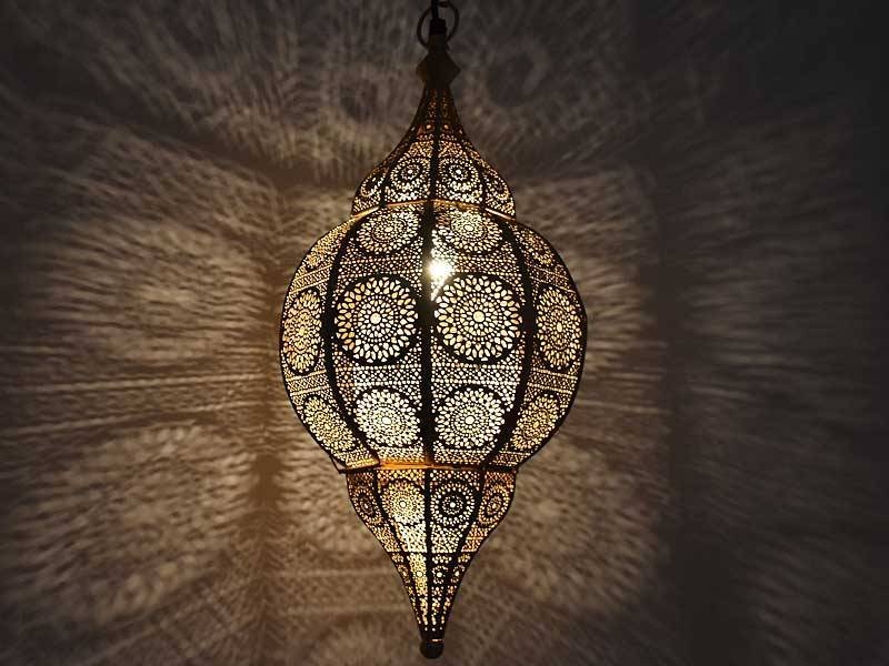 Eine weiße Pendelleuchte im echten orientalischen Filigran-Design, komplett handgefertigt mit orientalischen Mustern. Diese Lampe sieht aus, als käme sie direkt aus einem Märchen von 1001 Nacht. Die Innenseite dieser Lampe ist goldfarben, sodass sie warm und stimmungsvoll durchscheint. Stimmungsbeleuchtung muss nicht teuer sein, bei Merel in Wonderland finden Sie für jedes Budget eine schöne orientalische Pendelleuchte.