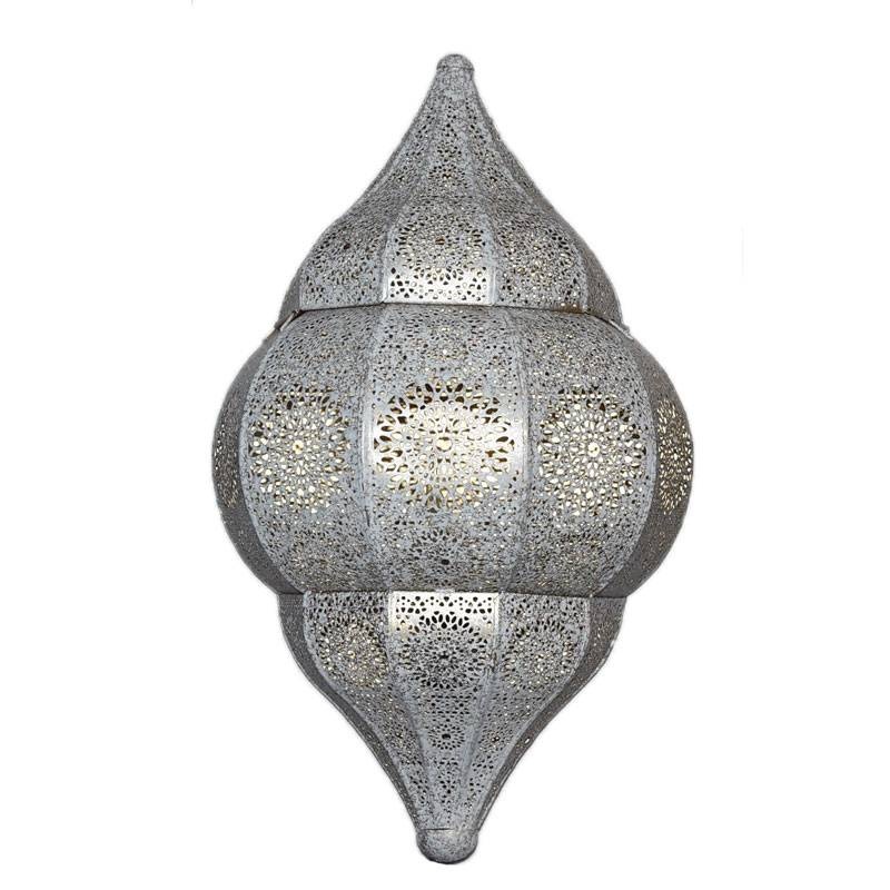 Weiß-goldene Wandlampe, die zur Serie der 1001-Nacht-Lampen passt und Ihnen ermöglicht, diesen orientalischen Stil in Ihrem Interieur umzusetzen. Diese Lampe spendet Licht im Treppenhaus oder neben dem Bett als Schlafzimmerbeleuchtung. Sie schafft eine gemütliche, romantische Atmosphäre, da die Innenseite goldfarben ist und mit einer Kerzenlampe darin sehr schön leuchtet. Die Blumen scheinen an der Wand und auf der Mauer durch, und das Aufhängen ist einfach erledigt. Die Wandlampe ist für den Einbau gemacht, sodass Sie sie direkt in die Wand anschließen können. Sie können bei Bedarf selbst eine Steckdose mit Kabel daran befestigen. Orientalische weiße Wandlampe. Die Lampe besteht aus Metall und ist leicht. Es ist auch schön, dass sie keine Wartung benötigt und nicht strahlend weiß ist, sondern einen goldenen Wascheffekt hat.