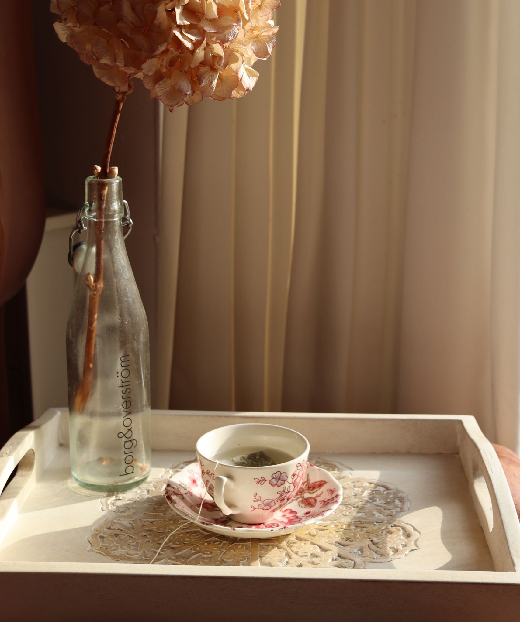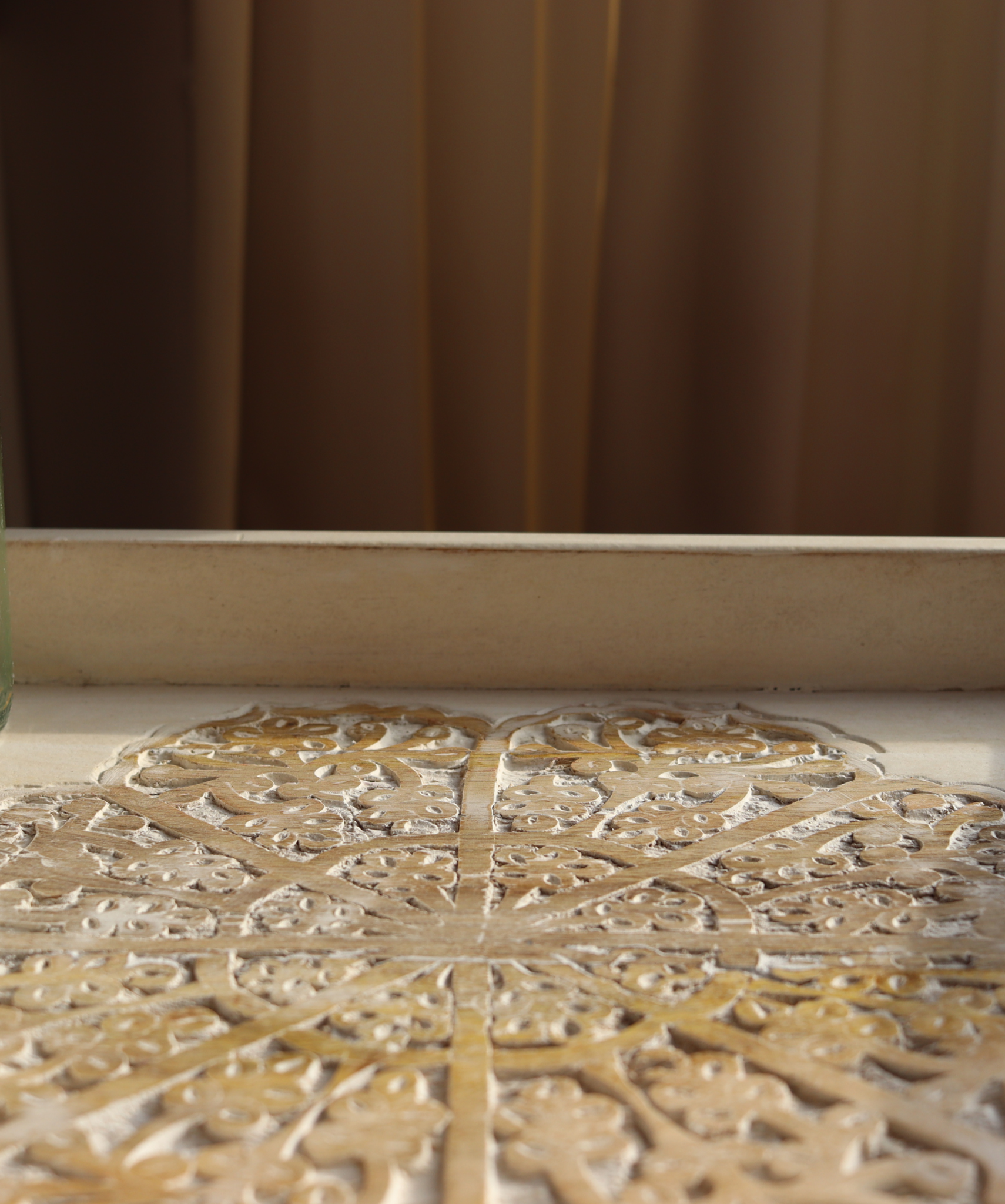 Weißes Holztablett mit schöner naturfarbener Lotusblume in der Mitte. Diese wurde von Hand geschnitzt und ist somit handgefertigt in Indien. Perfekt, um Essen oder Getränke zu servieren oder als Dekoration. Auch in Braun erhältlich.
